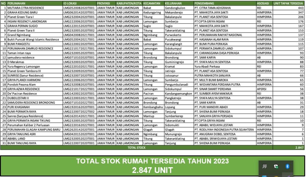 Disampaikan bahwa peluang untuk mendapatkan rumah murah di Lamongan sangat terbuka lebar. Sebab, sesuai data yang ada hingga kini total stock rumah masih tersedia sebanyak 2.847 unit, tersebar di sejumlah lokasi di wilayah Lamongan. Sejumlah unit rumah tersebut ada di 31 titik lokasi mulai Babat, Kedungpring, Paciran, hingga Lamongan kota pun tersedia. “Karena itu, mumpun masih ada stocknya silahkan dimanfaatkan dengan ketentuan yang berlaku,” tegas dia.